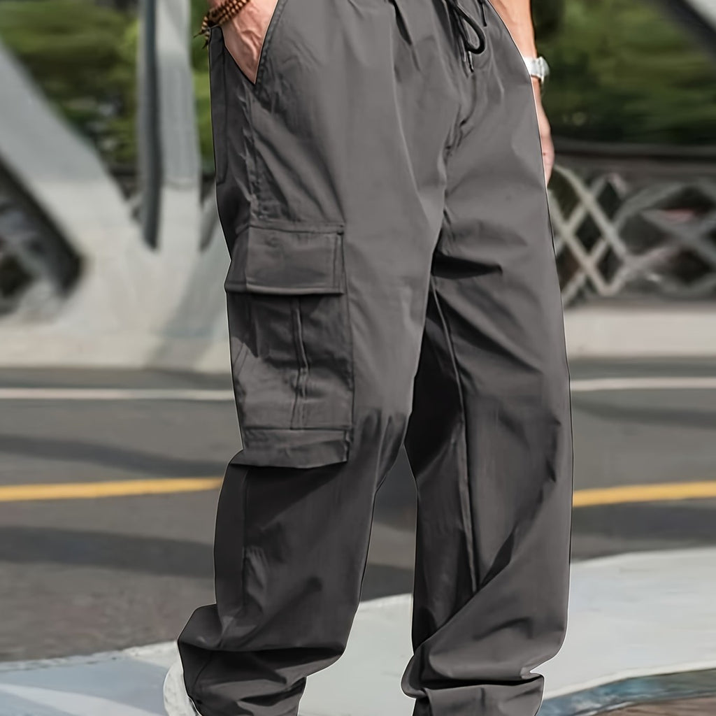 kkboxly Trendy Solid Cargo Pants, Men's Multi Flap Pocket Trousers, Loose Casual Outdoor Pants, Men's Work Pants Outdoors Streetwear Hip Hop Style