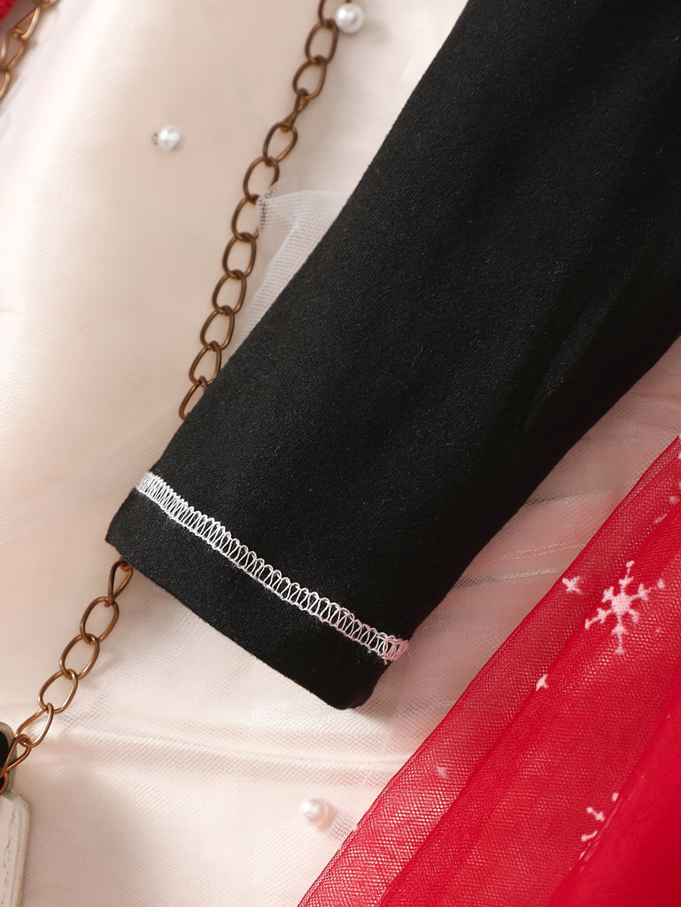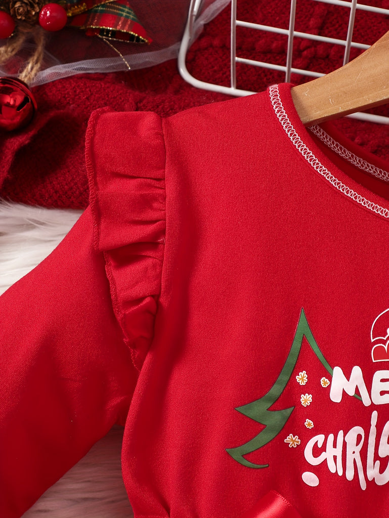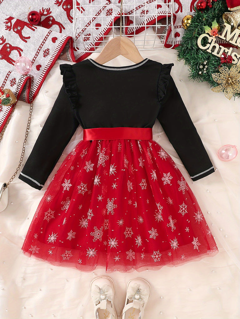 Long Sleeve MERRY CHRISTMAS Print Belted Mesh Dress for Girls, Festive Ruffle Spliced, Stylish & Cute, for Fall & Winter, as Christmas Gifts