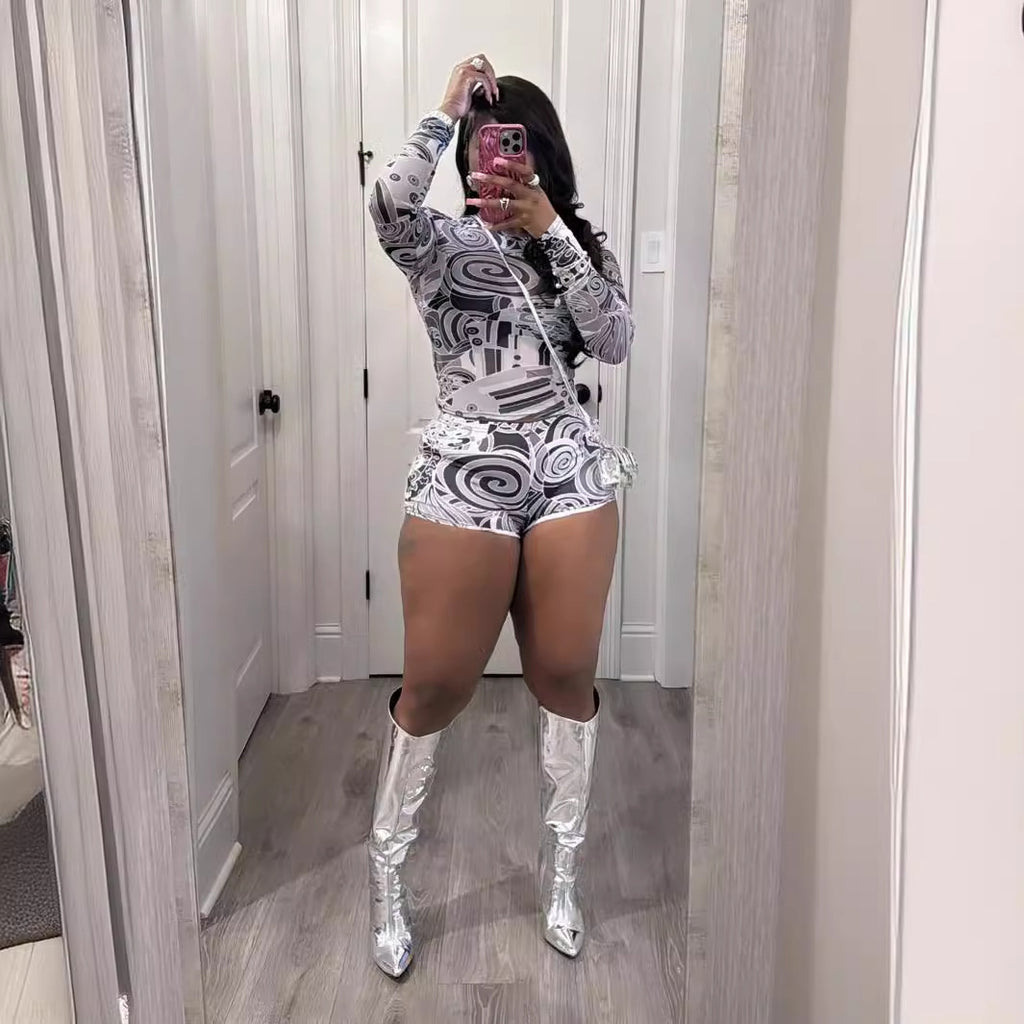 new New Popular trade mesh tight sexy printing round neck elastic casual long-sleeved shorts set