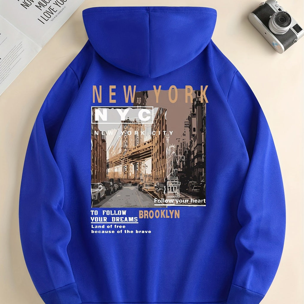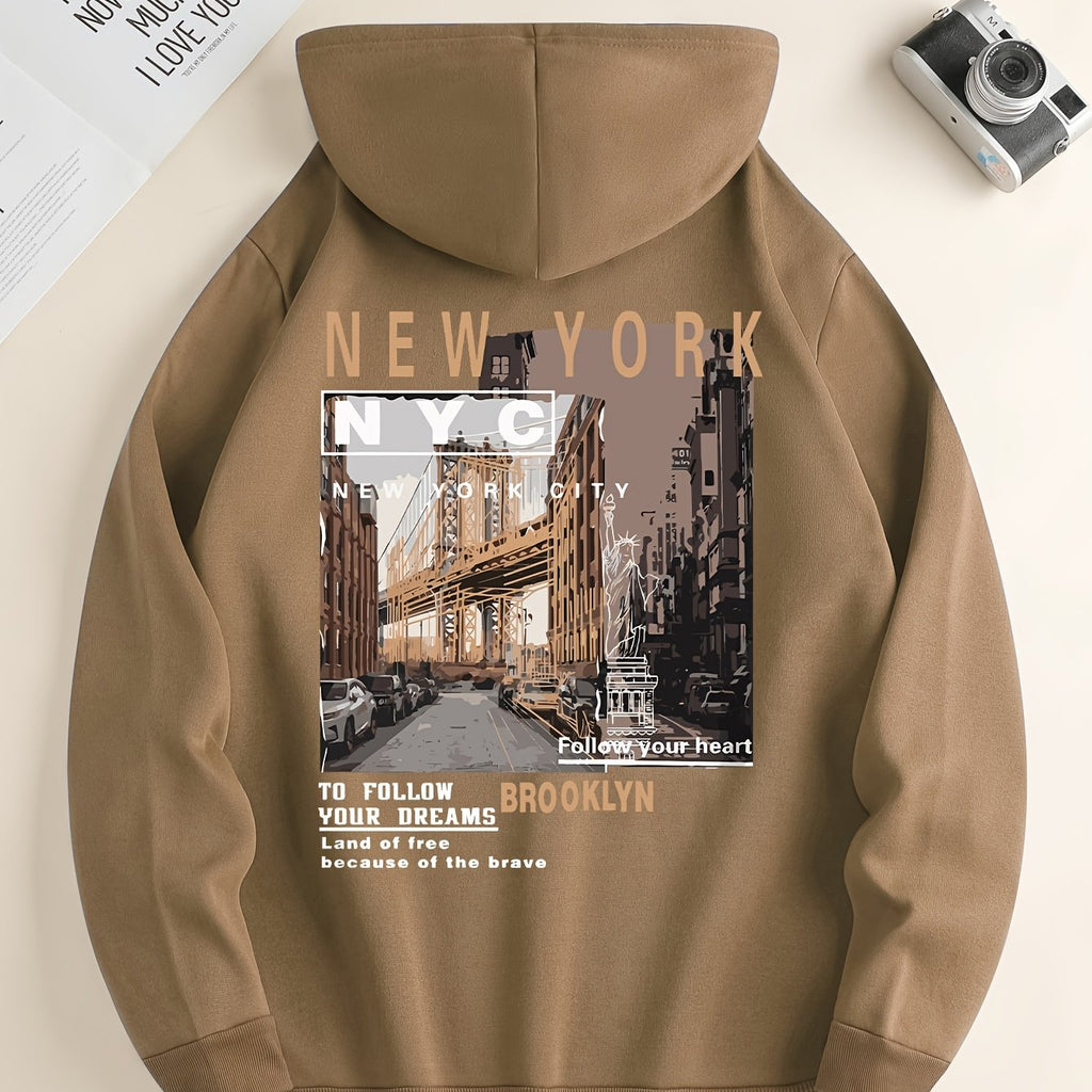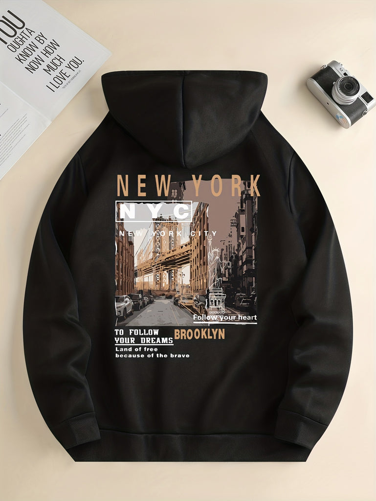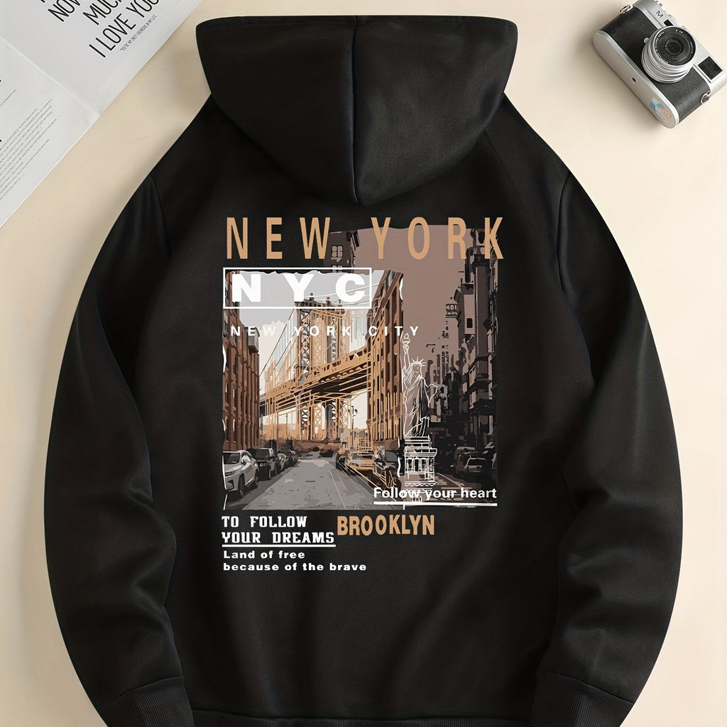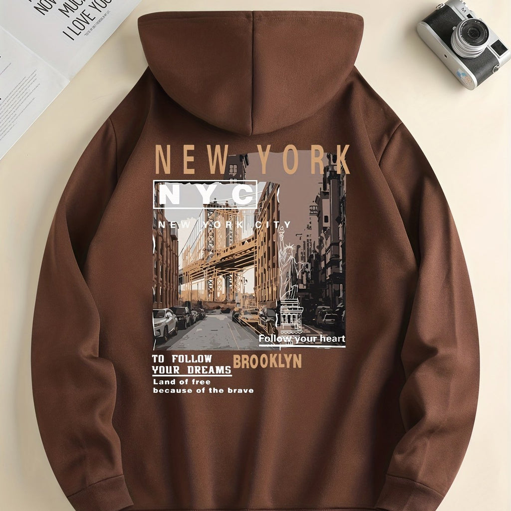 NYC Brooklyn Graphic Print Hoodie, Cool Hoodies For Men, Men's Casual Graphic Design Pullover Hooded Sweatshirt With Kangaroo Pocket Streetwear For Winter Fall, As Gifts