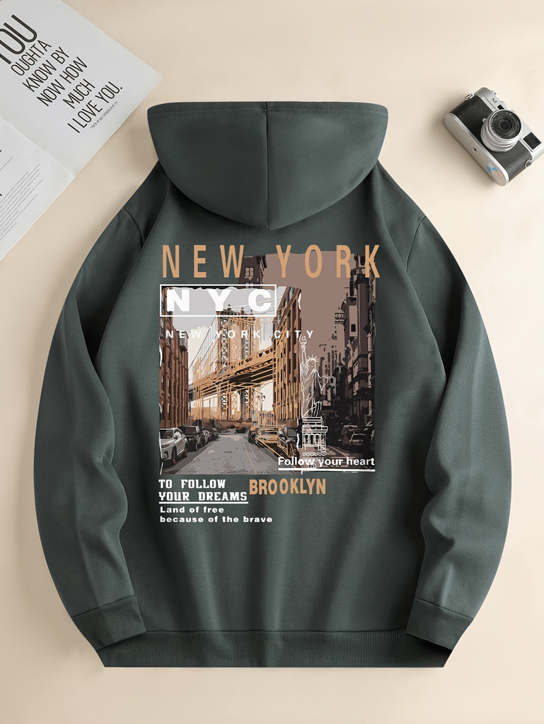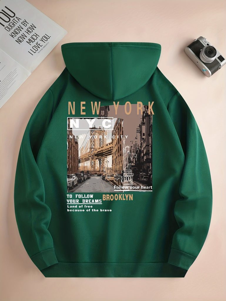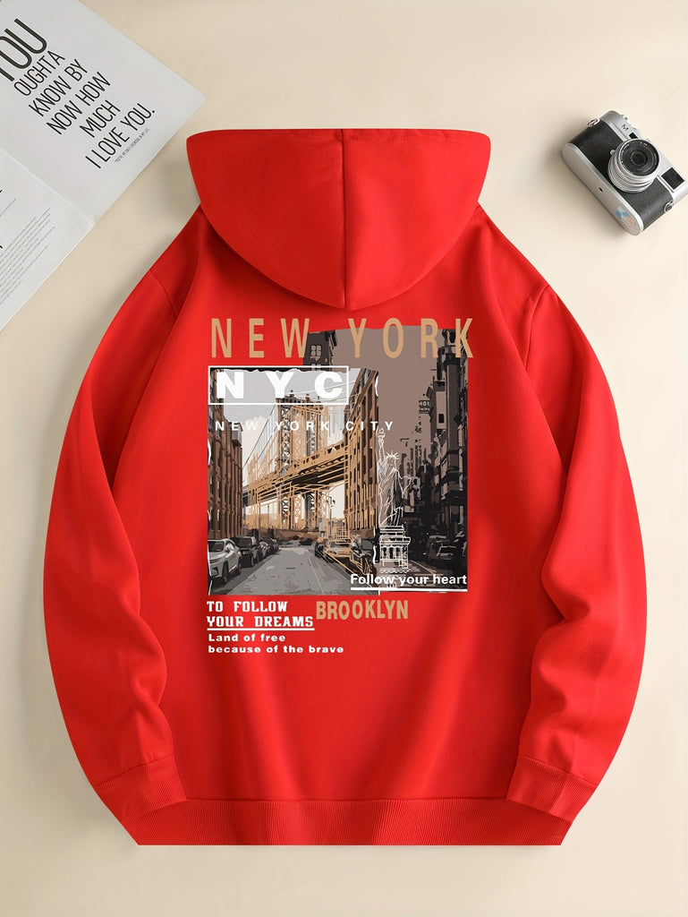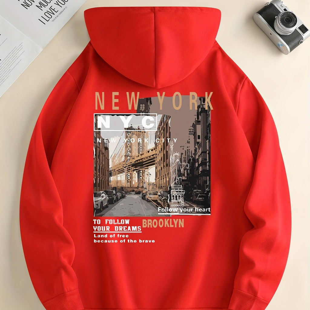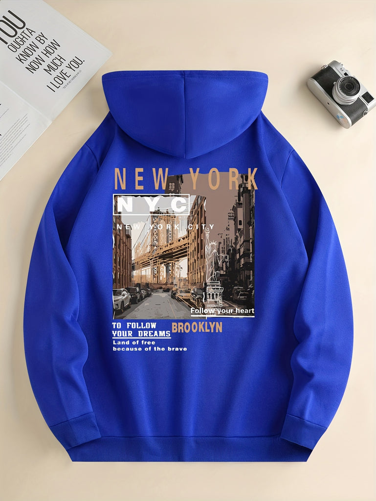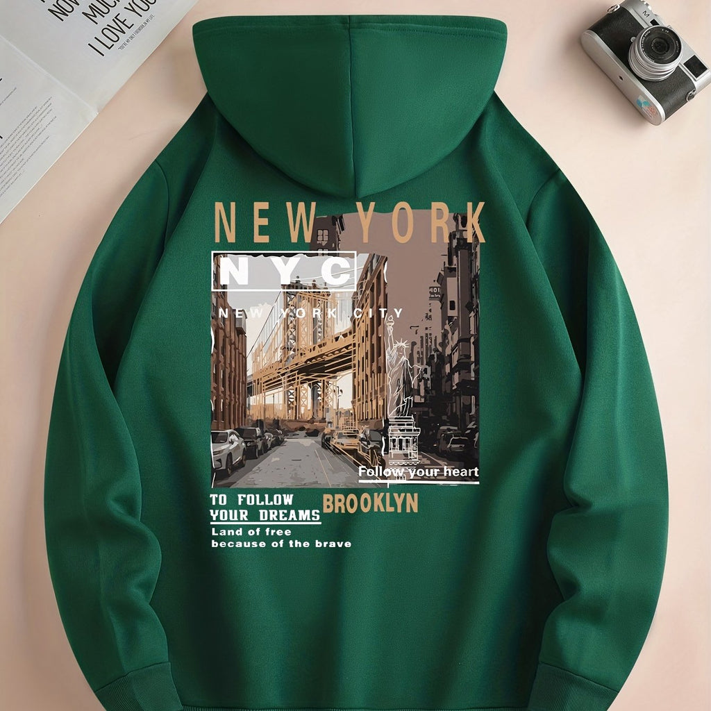 NYC Brooklyn Graphic Print Hoodie, Cool Hoodies For Men, Men's Casual Graphic Design Pullover Hooded Sweatshirt With Kangaroo Pocket Streetwear For Winter Fall, As Gifts