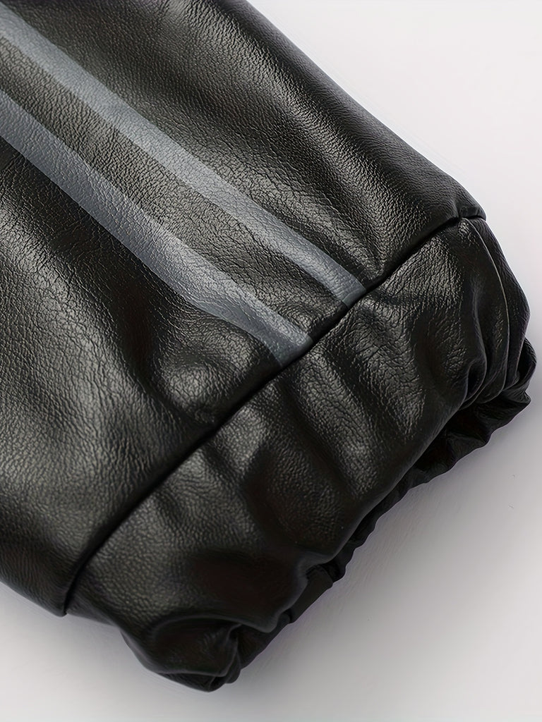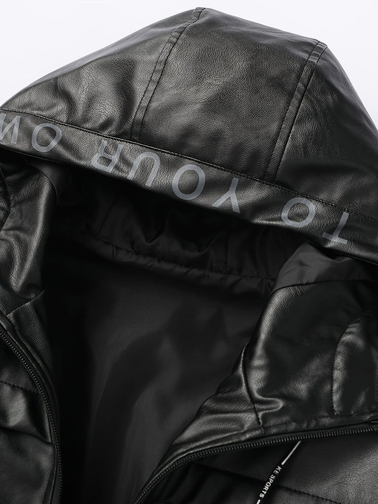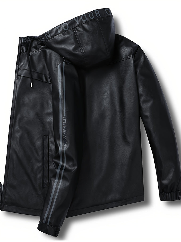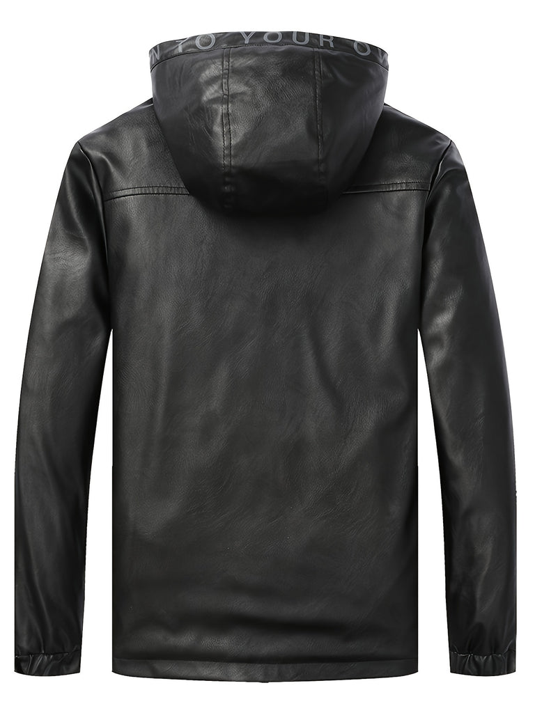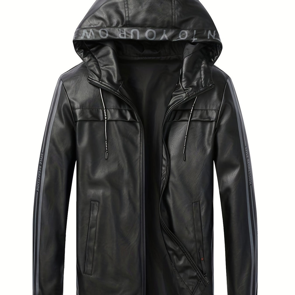 realaiot Men's Stylish Faux Leather Jacket With Pockets, Casual Breathable Zip Up Long Sleeve Hooded Jacket For Spring Fall Outdoor