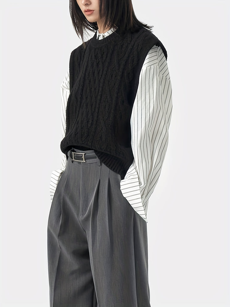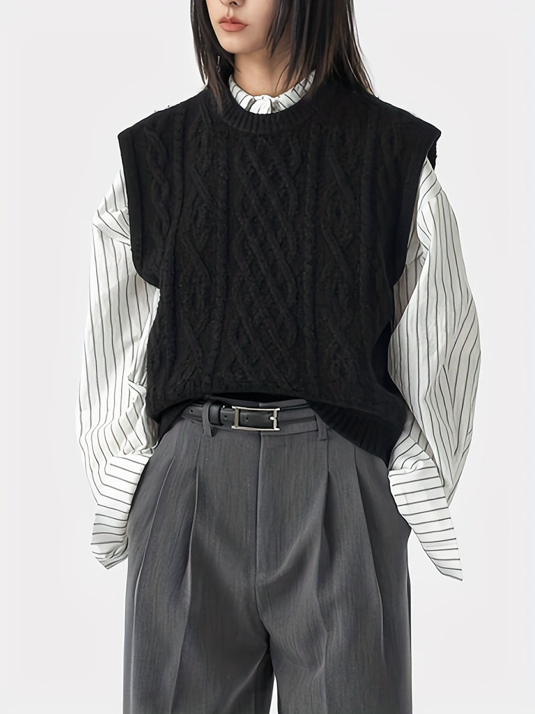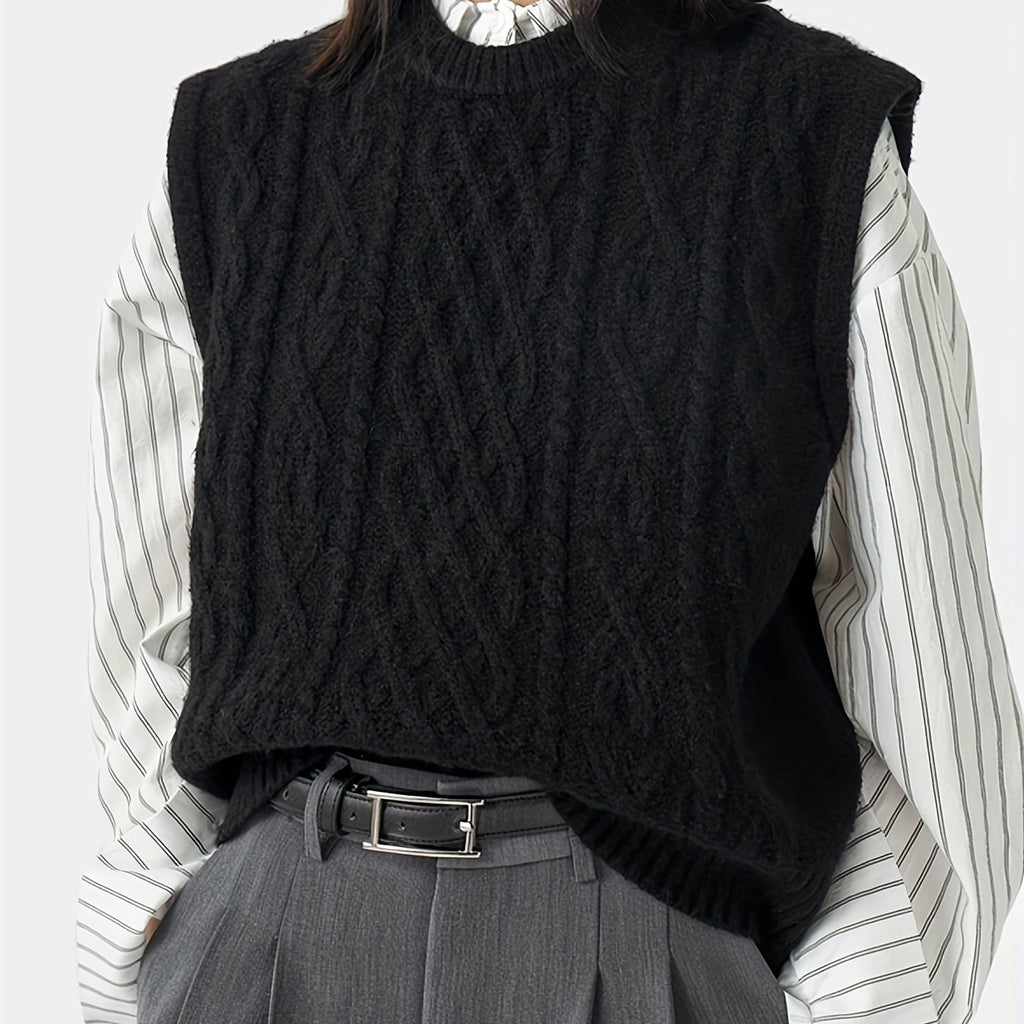 Solid Chunky Knitted Sweater Vest, Vintage Crew Neck Sweater Vest For Fall & Winter, Women's Clothing