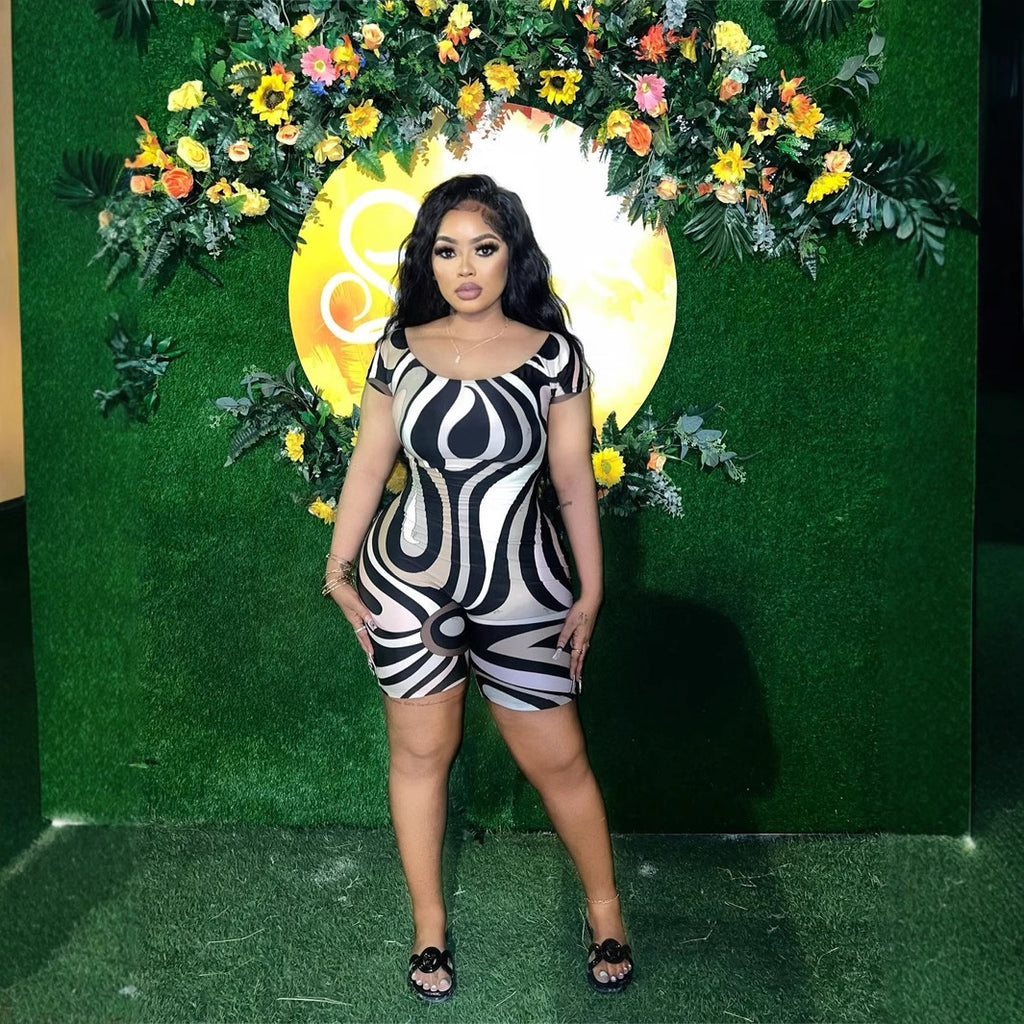 summer New Popular trade viral trends striped geometric pattern round neck short-sleeved jumpsuit wholesale